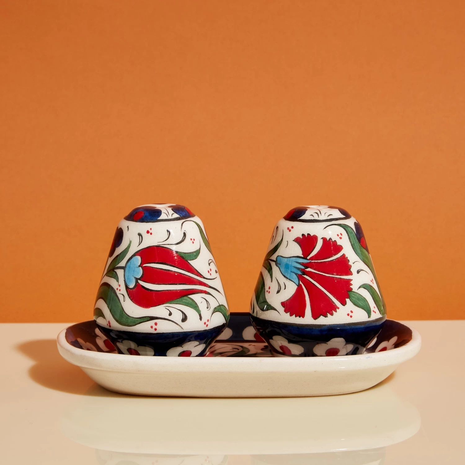 When traveling in Istanbul, our buyers found world-class Turkish ceramics at the Grand Bazaar—one of the world’s oldest markets—including these hand-painted salt and pepper shakers. They’re sourced from Kutahya, a Turkish city renowned for hand-painted pottery. The shakers are painted with vibrantly colored motifs inspired by Iznik tulip designs, featuring red and blue flowers. Iznik, an art form dating back to the 15th century, fuses Ottoman patterns and elements of Chinese design—its abstract patterns, floral motifs and bright colors are synonymous with fine Turkish ceramics. The shakers come with a small tray to hold them and catch any errant seasonings, also painted by hand with red and blue flowers. As every piece from this maker is crafted by hand, slight variations in design are natural and add to their beauty.