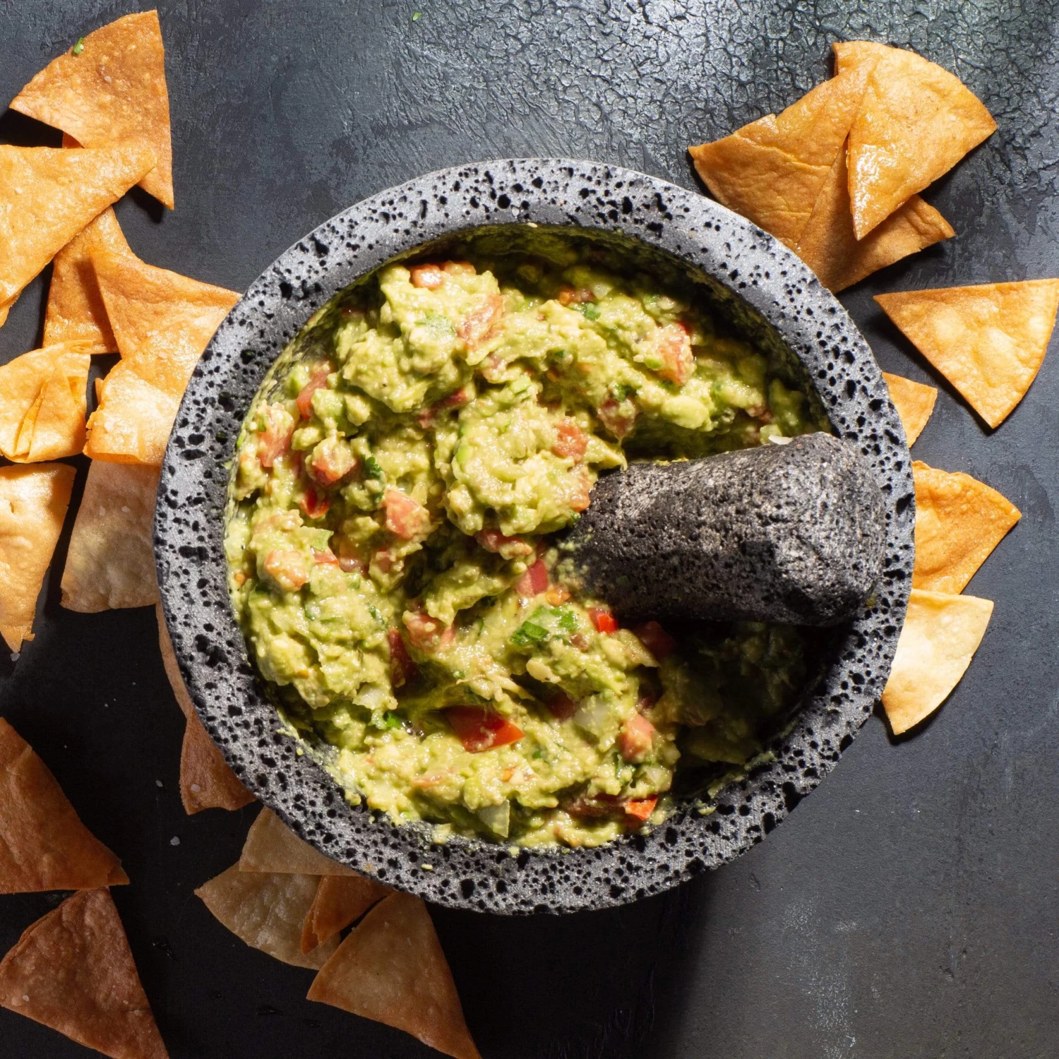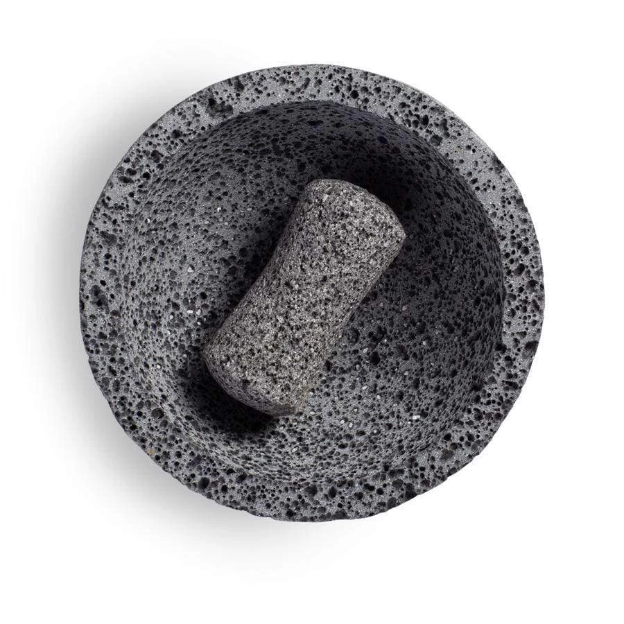 Materials: Volcanic stone[/accordion] Care and Use [/title]This is a natural product made from stone. Before first use, the molcajete needs to be seasoned (see our instructions below). It should be washed thoroughly in water using a coarse brush before use and between uses. Avoid detergents. Avoid abrupt temperature changes.[/accordions-break]The history of the molcajete dates back thousands of years.[/banner_heading]Used since pre-Hispanic times, it is usually carved from rough volcanic rock and shaped with a wide bowl and a three-footed base. The word “molcajete” is derived from the Nahuatl words “mollicaxtli” and “temolcaxitl,” meaning “bowl for sauce” or “stone bowl for the mole.” The pestle, called a tejolote, is also carved from rock, and together, they are used to grind spices, dried chilies, seeds, fresh or roasted chilies, tomatoes, tomatillos and onions. The coarse, porous basalt is ideal for mashing ingredients together for guacamole, as well as fresh roasted salsas and relishes. [/banner-text-break]Despite the similarities between the tools, one does not use the molcajete to pound ingredients as you would a mortar and pestle. Instead, you fit the tejolote into your palm and direct its movement with your fingertips as you grind ingredients against the rough stone. This molcajete is great not only for making guacamole and salsa, but also for grinding spices, grains and stale bread. Use it to break apart fresh, dried or toasted chilies, too.