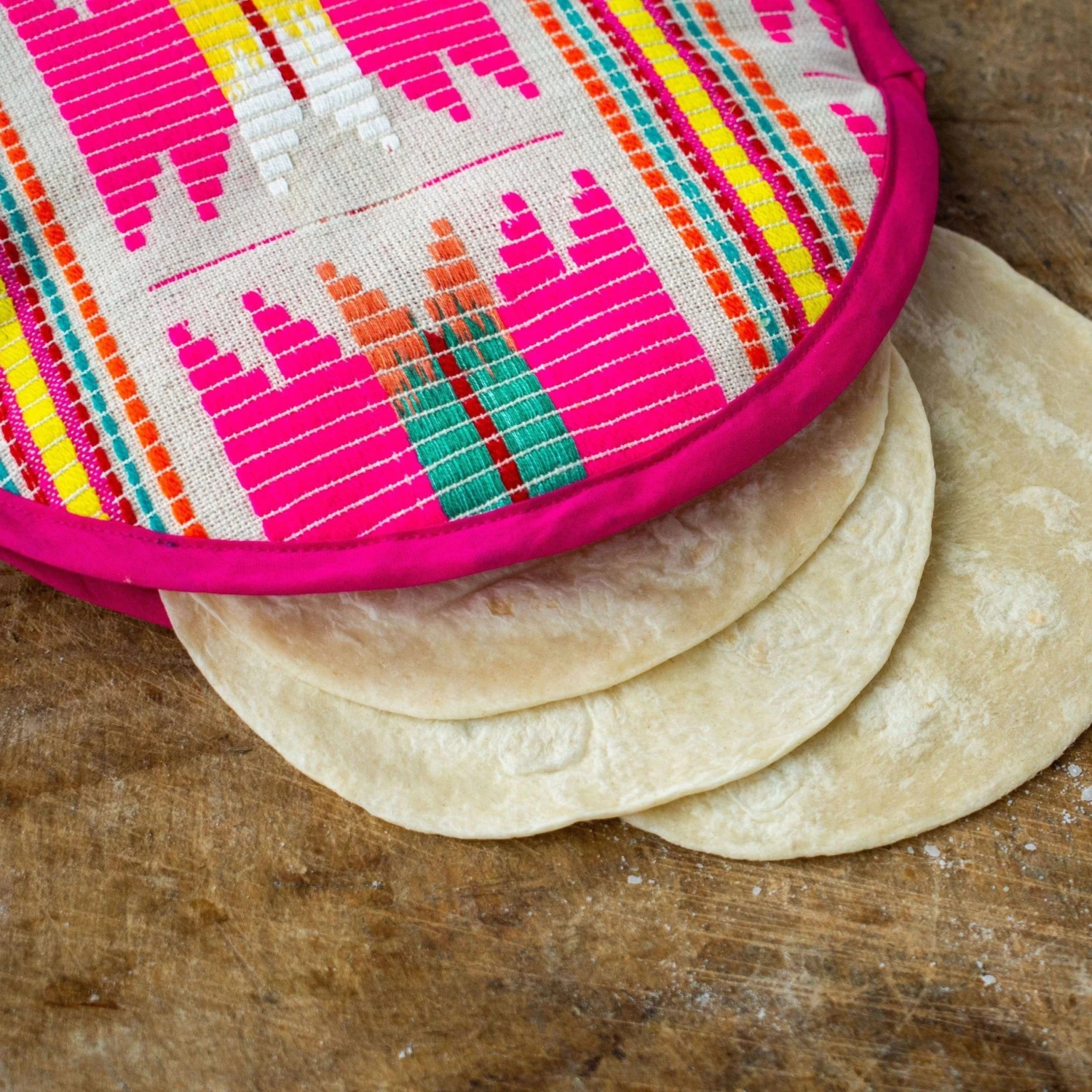 When serving tortillas, naan or pita breads with our sauces, we often make the flatbreads in batches ahead of time. In countries like Mexico, an insulated sleeve like this is essential for keeping tortillas hot for the duration of a meal or party. We love the festive colorful pattern on this neat product, which is handy for keeping all manner of flatbreads warm and retaining moisture for over an hour—we far prefer it to using a makeshift dish towel. Use the tortilla warmer as an attractive serving vessel for our Italian Piadina flatbreads or Middle Eastern Pita Bread in addition to tortillas.