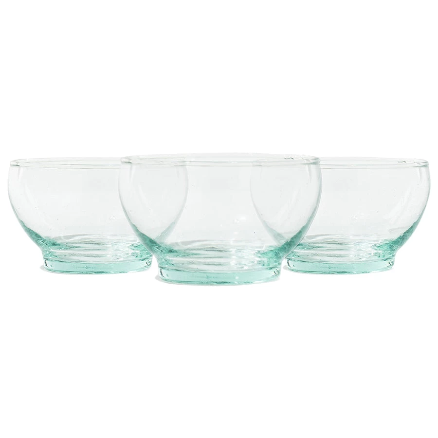 This beautiful set of small handblown Moroccan bowls is made by generational artisans from recycled glass by one of our favorite producers, Casablanca Market. Both decorative and useful, these bowls are perfect for serving a first course or dessert, or can be used as part of an elegant tabletop display. The set of three comes in green or clear glass. Casablanca Market is eco-conscious, using recyclable materials and employing eco-friendly practices whenever possible. In addition, they strive to provide financial security for the craftspeople who create their wares, helping to preserve and secure their artistic and culinary heritage.