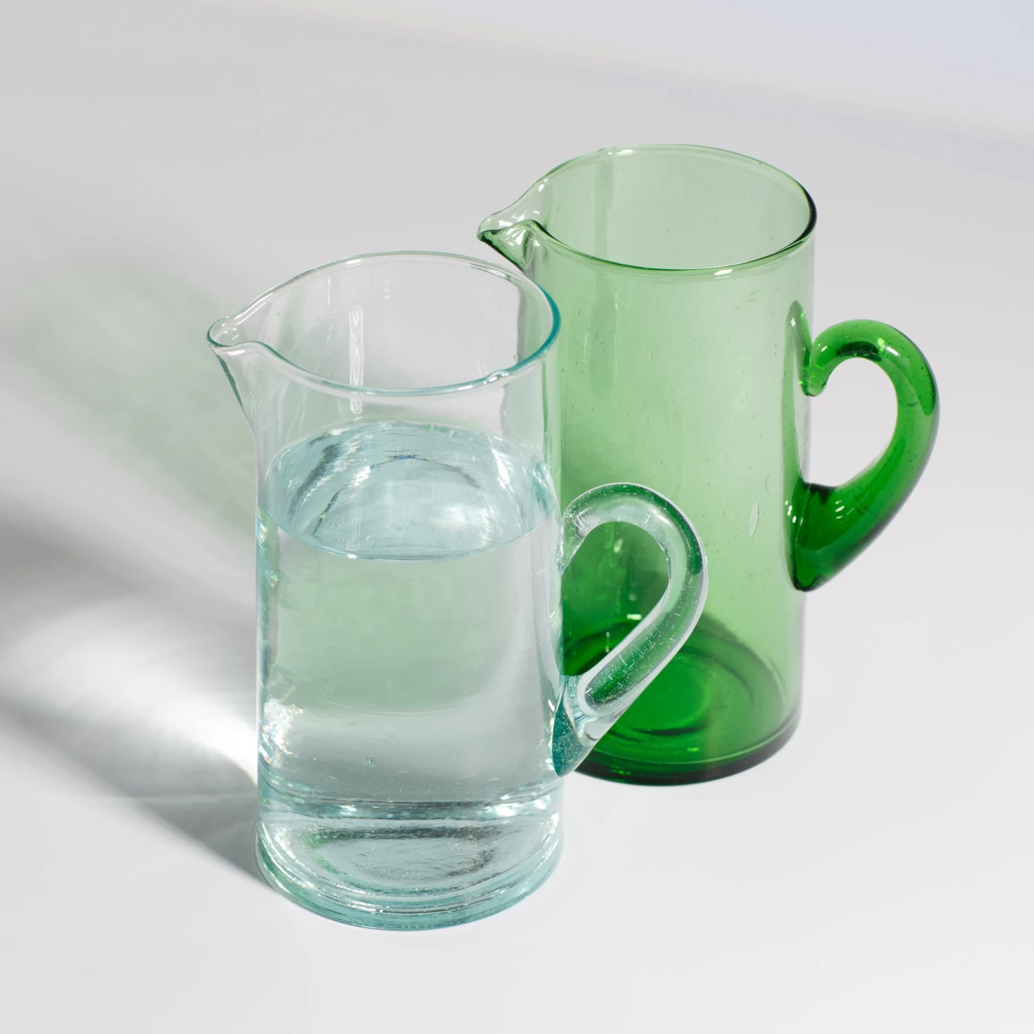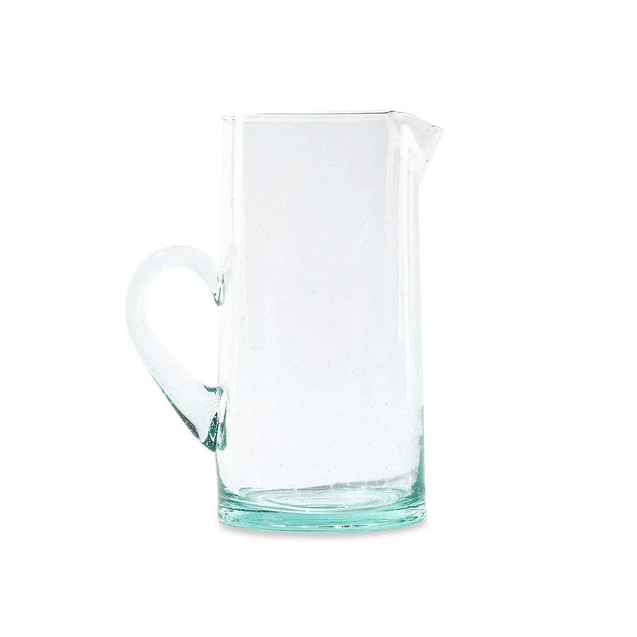 These beautiful handblown glass pitchers are made in Morocco by one of our favorite producers, Casablanca Market. Made from recycled glass by generational artisans, this simple and useful pitcher can be used for anything from beverages to flowers. We love the weight of it and how our hand fits snugly around the handle. The pitcher comes in green or clear glass. Casablanca Market is eco-conscious, using recyclable materials and employing sustainable practices whenever possible. In addition, they strive to provide financial security for the craftspeople who create their wares, helping to preserve and secure their artistic and culinary heritage.