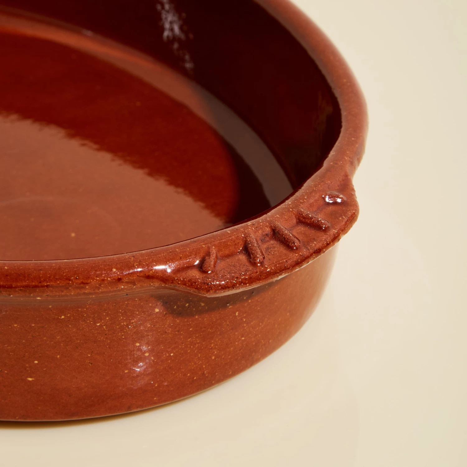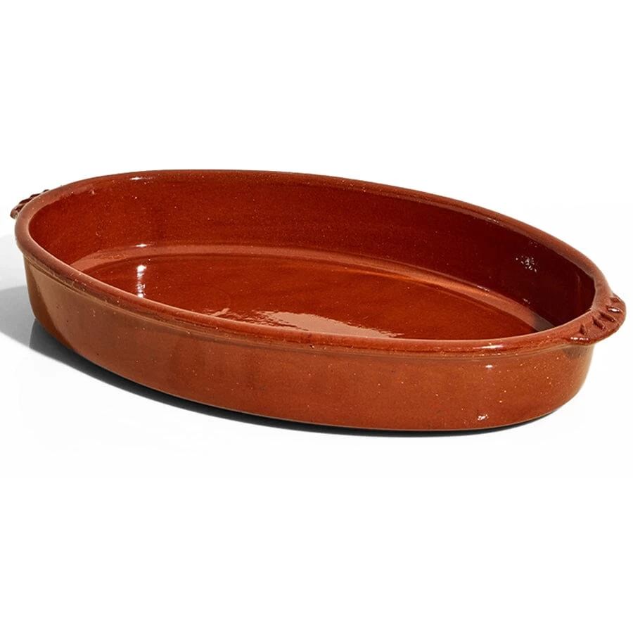 Crafted by hand, this large oval cazuela baking dish is produced in the village of La Rambla in southern Spain, an area with 4,000 years of pottery tradition. Made from red clay collected in the Spanish cities of Zamora, Valencia and Teruel, each dish is shaped and dried in the sun before being fired in a 1832℉ oven. The 15-inch length and low sides make it the perfect size for cooking everything from fish to roasts. Unlike some terracotta tabletop items that cannot withstand high temperatures, this casserole can handle slow, steady heat, so foods cook gently and evenly in the oven or over a medium flame on the grill. Each glazed piece is one of a kind and may come with slight variations.