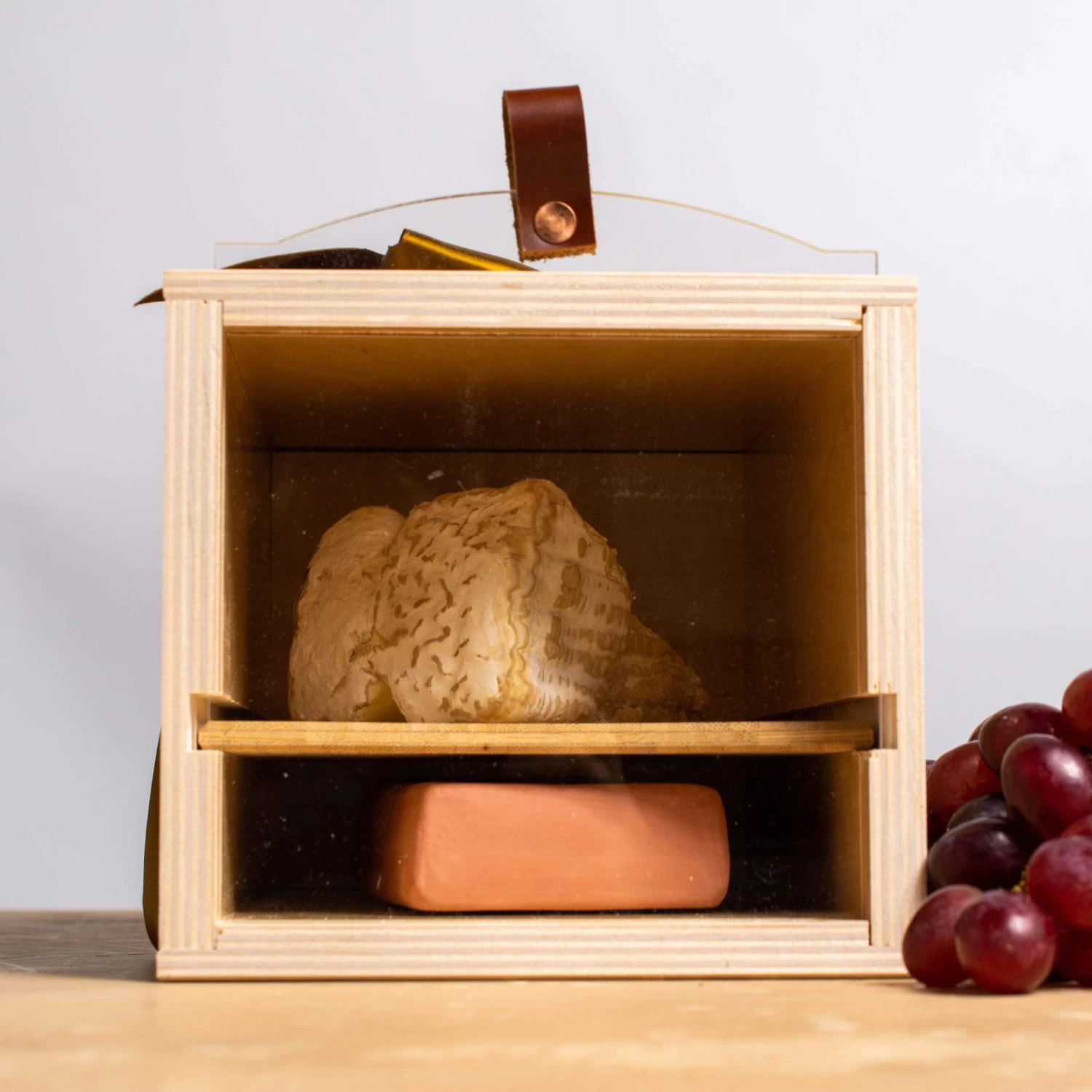 Care: Hand wash shelves with hot water and a splash of distilled white vinegar; air dry. Bottom brick should be submerged in water every few weeks to maintain correct humidity levels. [/accordions-break] Store your cheese like a pro. [/banner_heading] The Cheese Grotto was tested in a dairy lab against a typical cheese wrapping paper and it won out in prolonging a wedge’s shelf life. Not only will it cut down on wrapping waste, but the grotto also creates a perfect microclimate in its interior via its eco-friendly materials, like breathable bamboo wood. [/banner-text-break] What we especially love about this stunning cheese grotto is the flexibility it offers: place the grotto in the fridge for up to 3-6 weeks for longer storage, or feel free to keep the grotto on your counter (it’s attractive enough to do so) for 7-10 days at room temperature, so your cheese is ready to enjoy anytime. [/how-to-use-break] Can keep on counter for 7-10 days if room is under 70 degrees; otherwise, store in refrigerator. Hand wash shelves with hot water and a splash of distilled white vinegar; air dry. Bottom brick should be submerged in water every few weeks to maintain correct humidity levels.