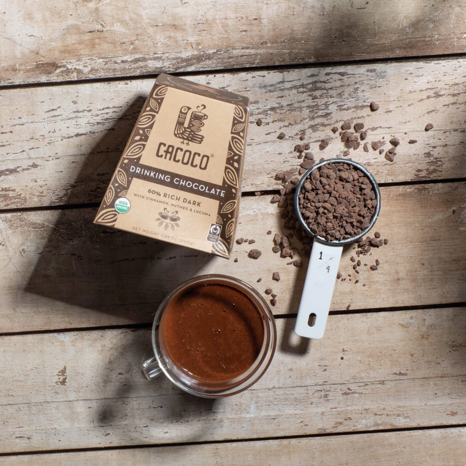 South American Heirloom Cacao is used in every Cacoco drinking chocolate for a perfect balance of fruity, floral and nutty notes. All cacao is certified organic from biodynamic farms that support lush ecological diversity, and all farming partners are paid fair trade wages or above. 60% Rich Dark has a deep, concentrated flavor with barely there hints of cinnamon and nutmeg. As with all drinking chocolates, its consistency is velvety and smooth, much thicker and more luscious than typical powdered hot cocoa. This version also contains lucuma, a fruit from South America, which gives the drink a natural, subtle sweetness.