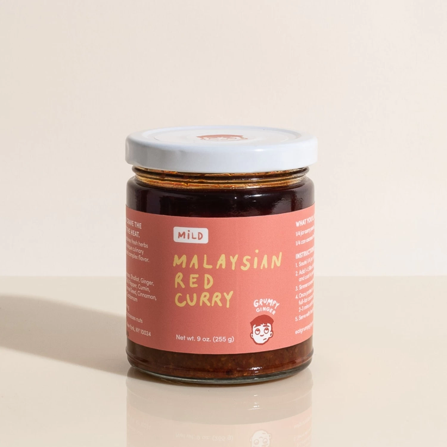 [/description-break] Ingredients [/title] Ingredients: Sunflower Oil, Lemon Grass, Shallot, Ginger, Garlic, Sea Salt, Red Chili Pepper, Cumin, Coriander, Turmeric, Fennel Seed, Cinnamon, Black Pepper, Cloves, CardamomAllergens: Made in a facility that processes nuts[/accordion] Specifications [/title] Net Weight: 9 ounces [/accordions-break] Try Grumpy Ginger’s go-to formula for a Malaysian red curry: simmer 1/4 cup Grumpy Ginger, 1 1/2 pounds protein, 2 potatoes, 1 tomato and 1/4 cup coconut milk. We suggest adding additional vegetables—like summer squash or snow peas—and serving over rice. [/how-to-use-break] Â