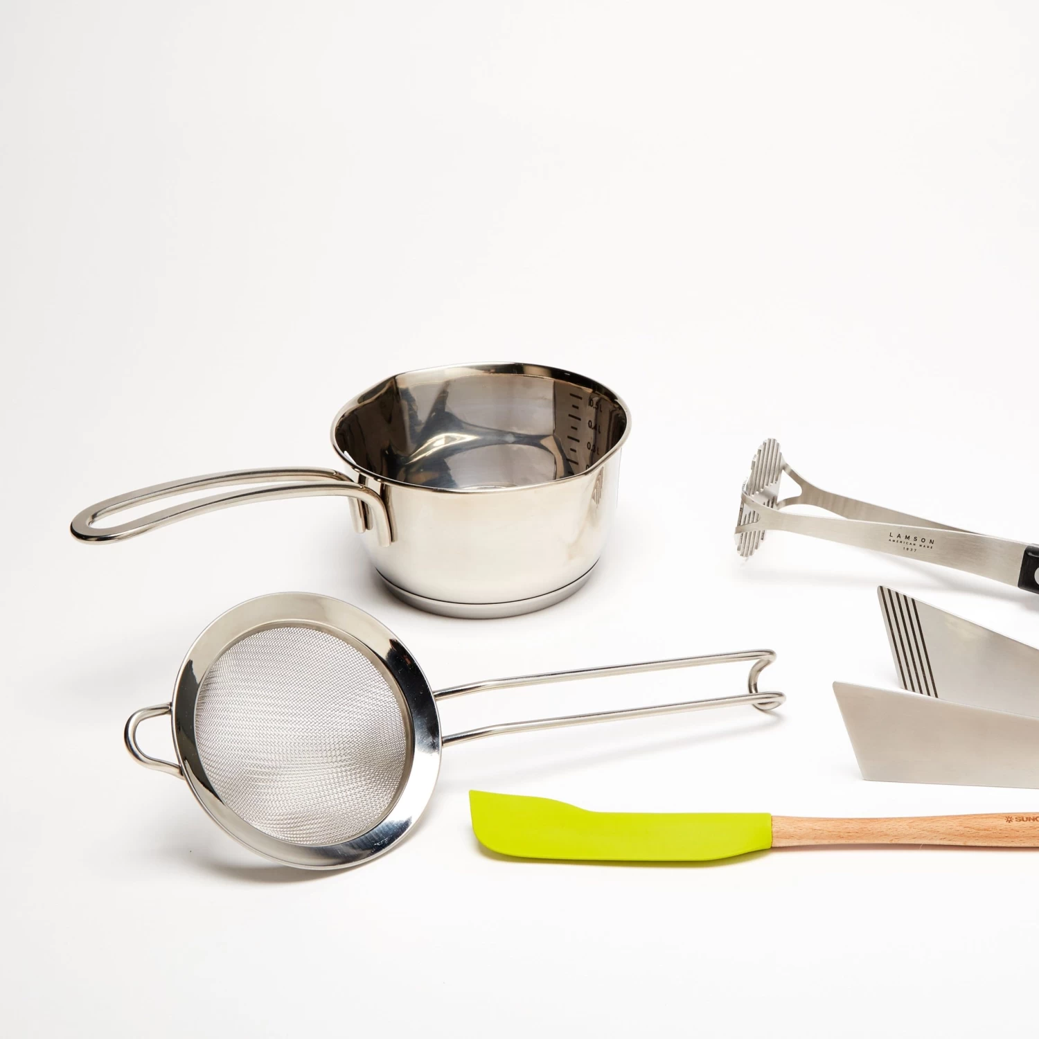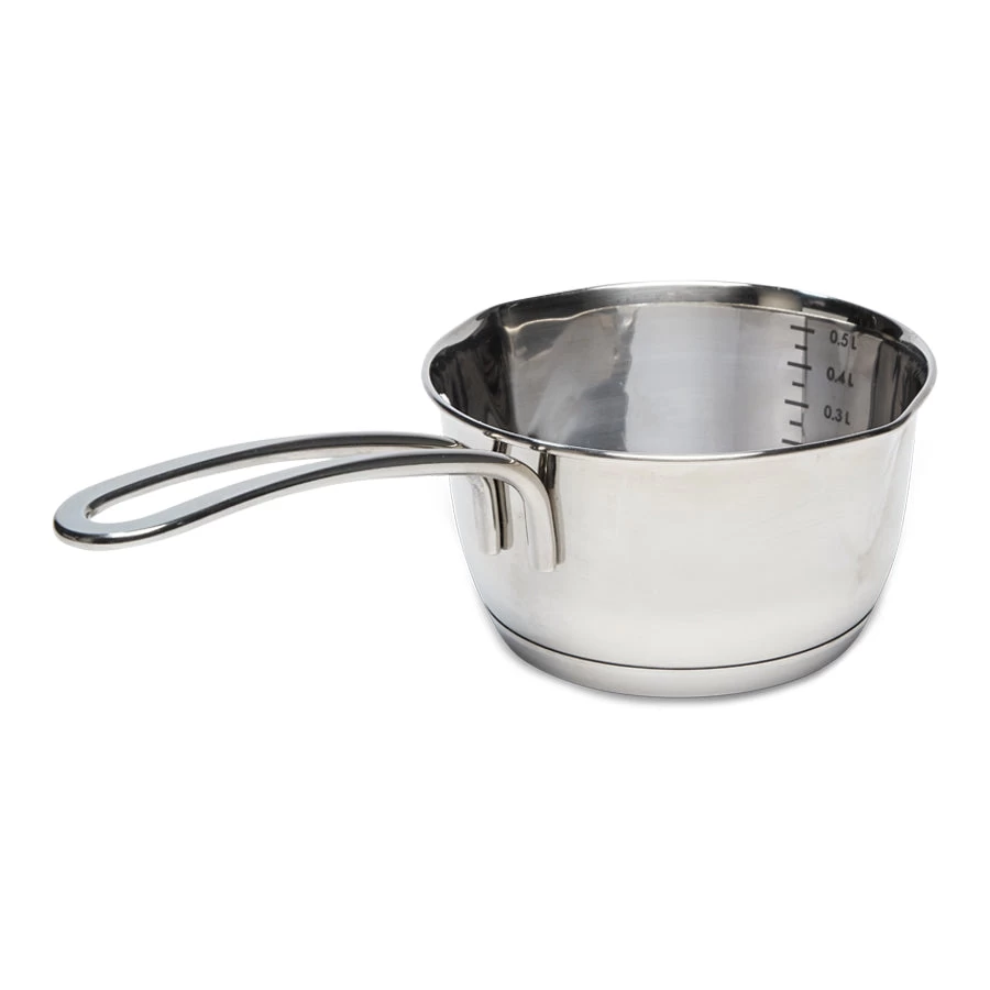 Most cookware lines lack a small, convenient pot for minor tasks: This half-quart saucepan from Küchenprofi fills that gap. Use this small pot for quick stovetop tasks, like melting butter; it comes with one spout on each side, ideal for pouring heated sauce or broth, as well as an ergonomic, heat-proof handle that’ll keep your hand safe from burns. Clad-bottom pots are ideal saucepans: They have a layered base, usually comprised of a heat-conductive copper or aluminum center sandwiched inside an external stainless steel layer, which concentrates heat at the bottom of the pot for faster cooking. This one has high quality 18/8 stainless steel sides (complete with metric gradation marks through 500 millimeters) and a magnetic steel encapsulated base that’s compatible with induction, gas and electric stoves.