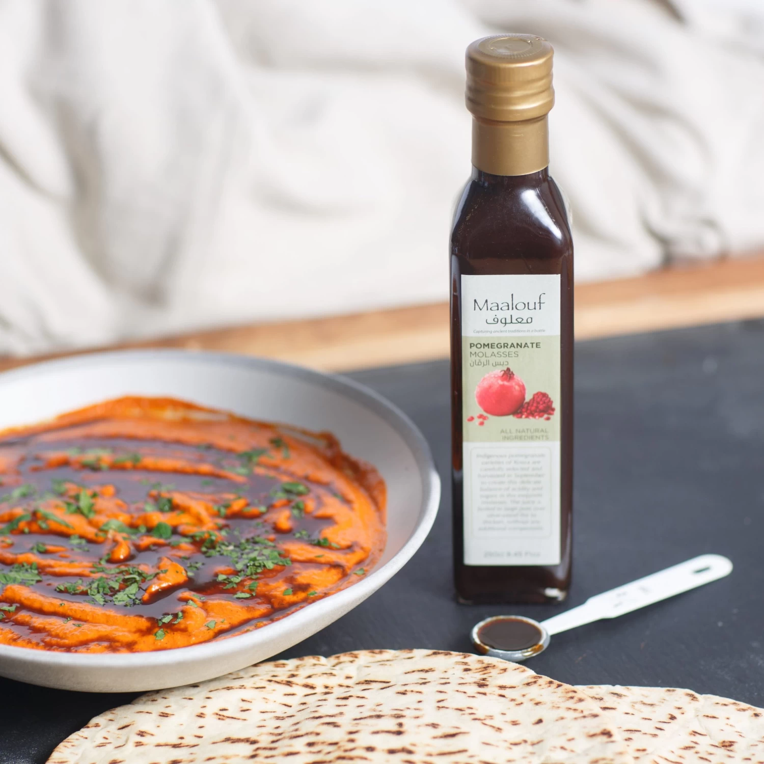 Place of Origin: Lebanon[/accordions-break] Next to his olive groves, Chafic Maalouf planted 630 pomegranate trees across two acres. [/banner_heading] The soil’s mixture of clay and silt, very rich in potassium, calcium and other minerals all contribute to the fruit’s depth of flavor. Capturing the perfect balance of sugars and acidity in the fruit for harvest is a tricky game, requiring a trained person to visit the orchard every morning in September, choose a few pomegranates and taste them to determine if they are ready for picking.[/banner-text-break] Use Maalouf pomegranate molasses when you want to balance out the savory or sweet notes of a dish–much like you might add lemon juice to a dish, but when you also want to provide a background sweet note and complexity. We love it stirred into vinaigrettes like for our Seared Scallop and Arugula Salad with Pomegranate Vinaigrette, added to boost the savory flavor of lamb or beef like in our Rib-Eye Steaks with Rosemary and Pomegranate Molasses, or drizzled over Middle Eastern dips like our Muhammara. [/how-to-use-break]