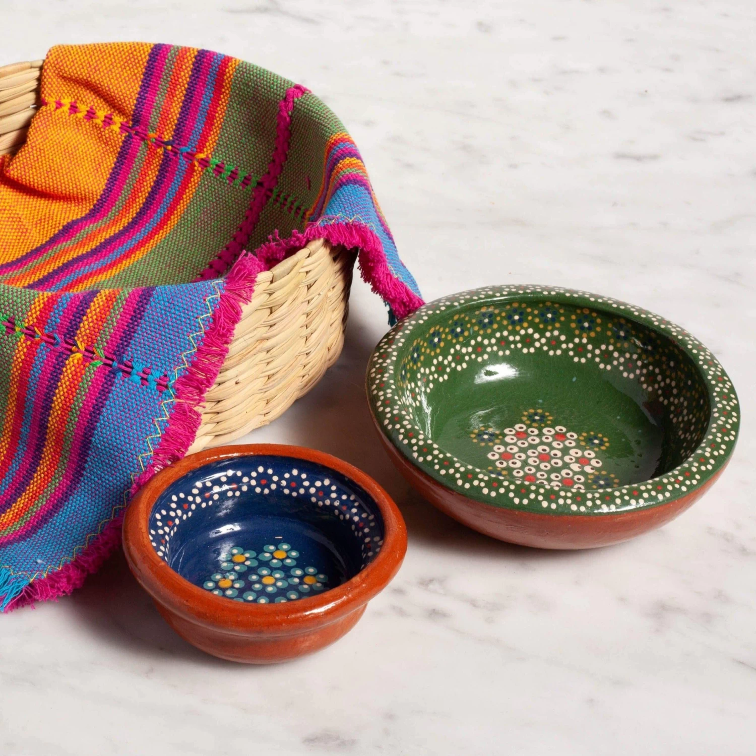 These lovely little bowls are handmade by artisans in Capula, Michoacán. We love the traditional touch these give a tabletop when filled with herby garnishes, dipping sauces and small snacks like olives or nuts. Available in blue or green.