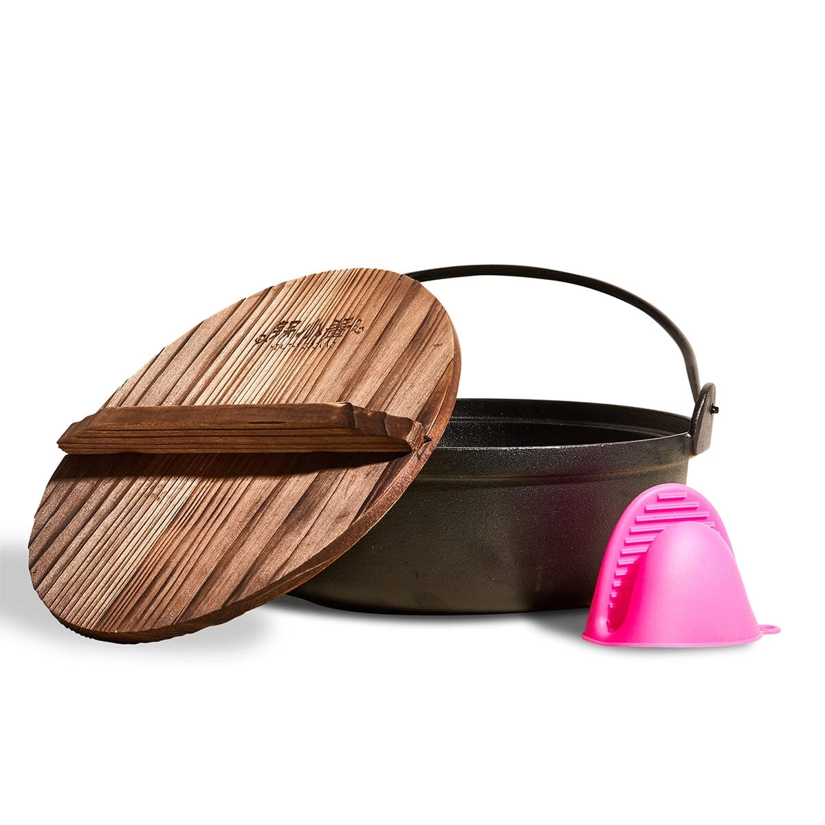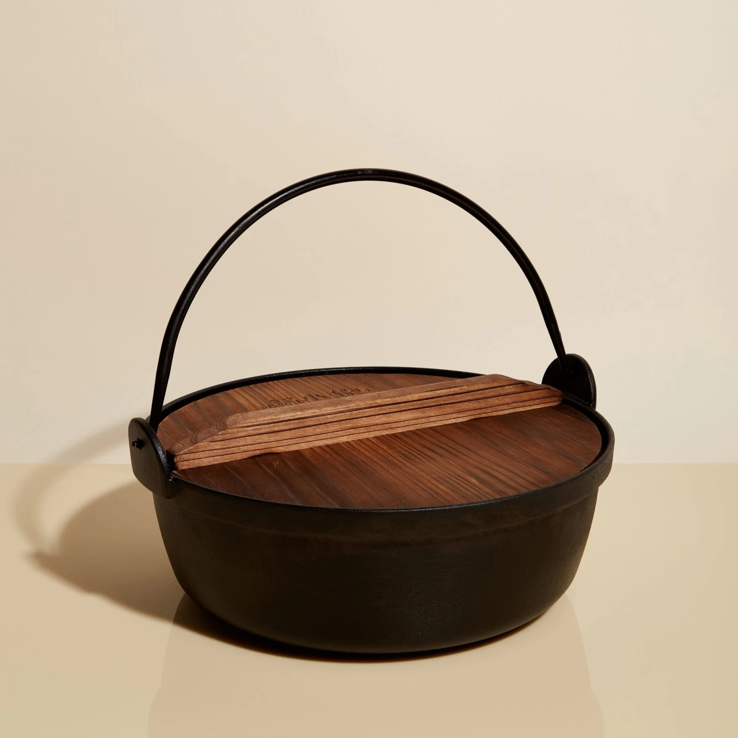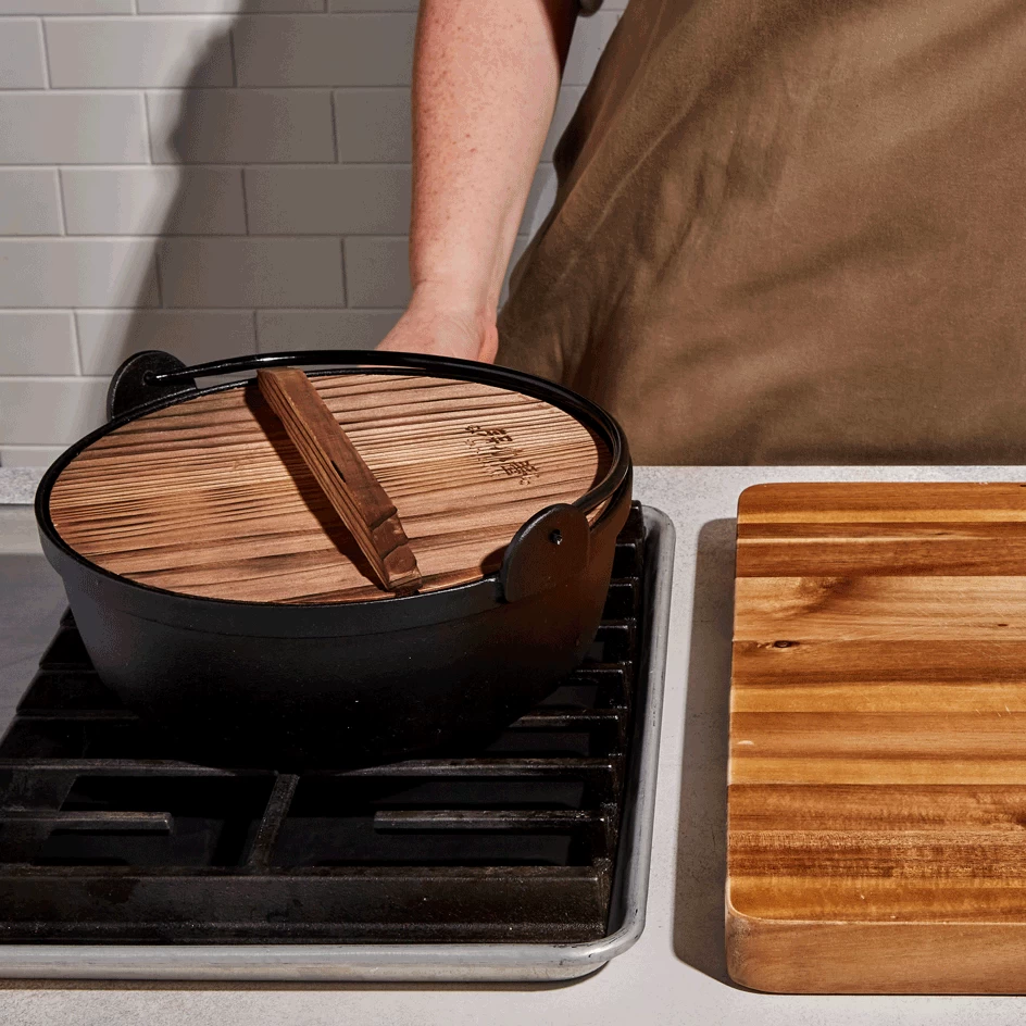 Care: Wood lid not oven-safe. Not dishwasher safe. To avoid rusting, wipe dry immediately after cleaning. [/accordions-break]Traditionally used for nabe, communal hot pot-style meals in Japan. [/banner_heading]Noodles, meat, seafood and vegetables are added to a simmering seasoned broth in a pot next to—or built into—the table and left to cook, like fondue but with broth. [/banner-text-break]Use to make soups and stews. We especially like using it to make our Miso Soup with Shiitake Mushrooms and Poached Eggs, Tofu and Kimchi Soup or Udon Noodles in Soy Broth. [/how-to-use-break]Safe for use on gas and induction cooktops, the grill or any open flame. Season before use. Not dishwasher safe. To avoid rusting, wipe dry immediately after cleaning.