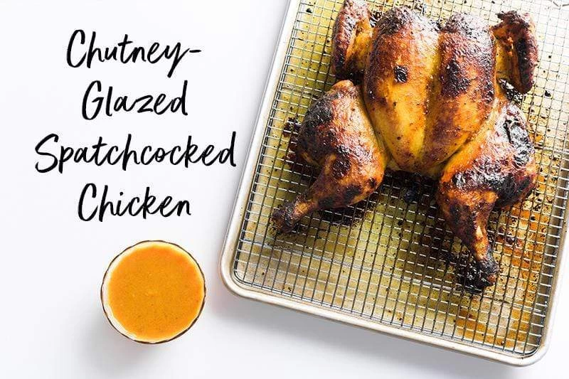 Chutney-Glazed Spatchcocked Chicken: It turns out that chutney (mango or tamarind) makes a terrific glaze when mixed with melted butter, lemon juice and turmeric. Brush half the mixture on before roasting and the balance after 40 minutes. Use the reserved sauce for serving. Simple and delicious.
