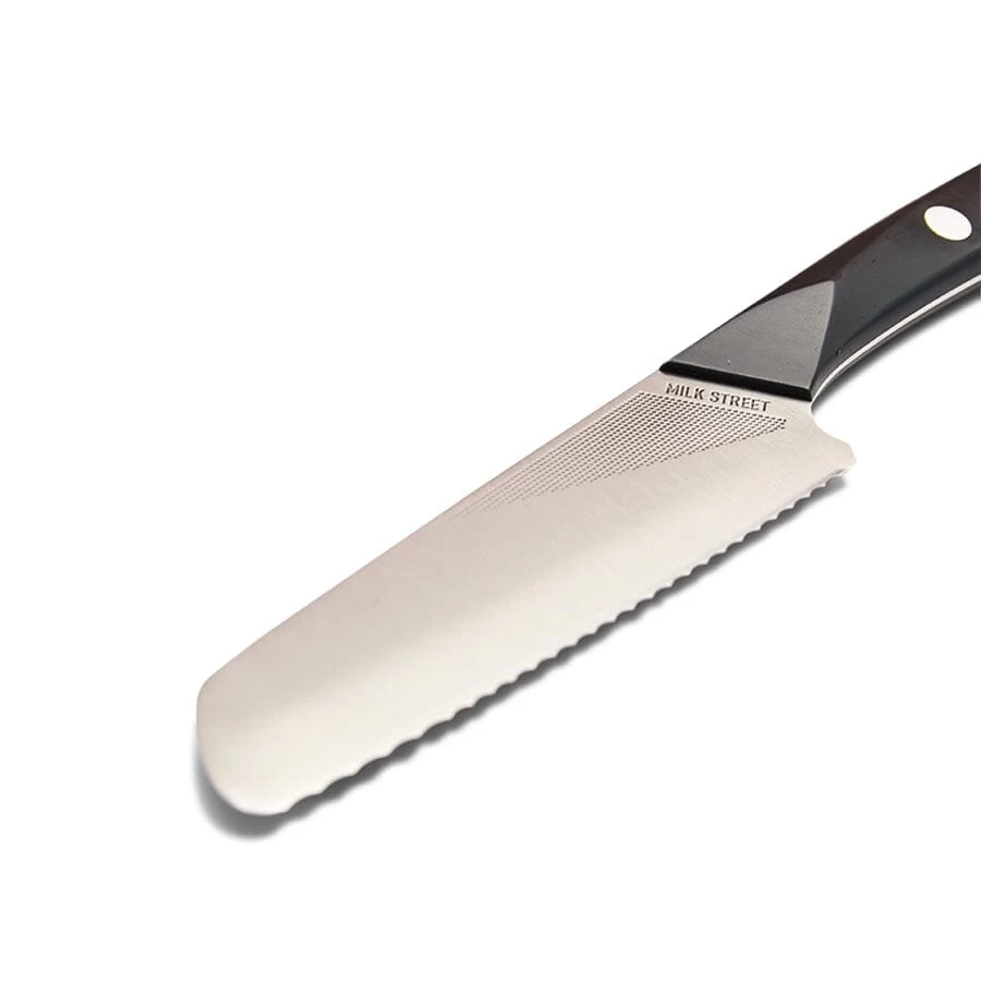 The serrated Milk Street Kitchin-tan utility knife will be the most useful knife in your kitchen. It’s a pinch-hitting wonder that spans the gap between a chef’s knife and paring knife. It’s long enough for many big tasks, but small enough for detail work. We’ve taken the proven shape and functionality of the Kitchin-tan and added a maintenance-free serrated edge. The grippy razor teeth effortlessly slice though anything and everything: thick-skinned tomatoes and peppers, fibrous broccoli stems and asparagus stalks, rubbery citrus peels. You’ll be amazed at how often you use this knife.