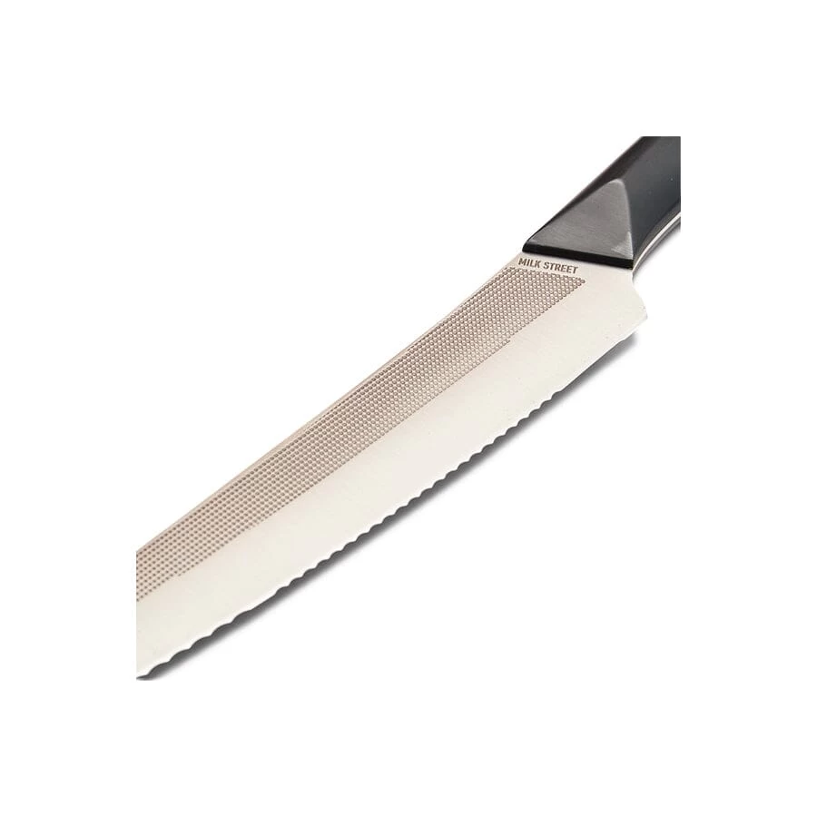 The typical bread knife tears its way through loaves and mashes tomatoes to pulp. So we spent months re-engineering the bread knife from the ground up, testing competitors’ knives to learn what we wanted and discarding what we didn’t. The result, the *Milk Street Tri-Edge Bread Knife*, perfectly handles it all, slicing easily through any style of bread, delicate pastries, overstuffed sandwiches and tough tomatoes. It’s also the perfect knife for difficult tasks, like chopping nuts and chocolate, handling dried fruit, and cutting up large blocks of butter.