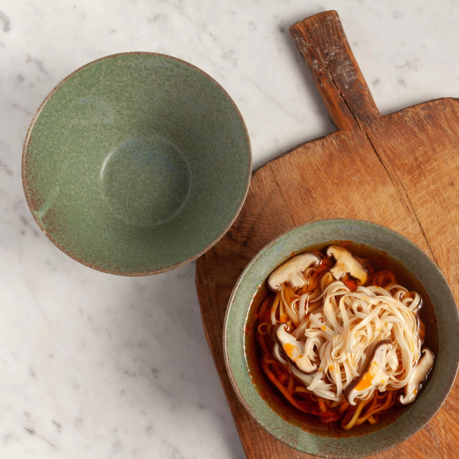 Fired in Japan’s Gifu Prefecture, an area famous for its tablewares, these ohgigatadon-style ramen bowls are functional and contemporary. Hand-glazed with a stunning mottled/matte finish, the stoneware bowls are equal parts durable and elegant. The mossy color was inspired by Japan’s beautiful gardens and the easily stackable fan-shaped design—a sleeker take on the traditional shape—is a popular choice among Japan’s high-end eateries. The bowls come in a set of two.