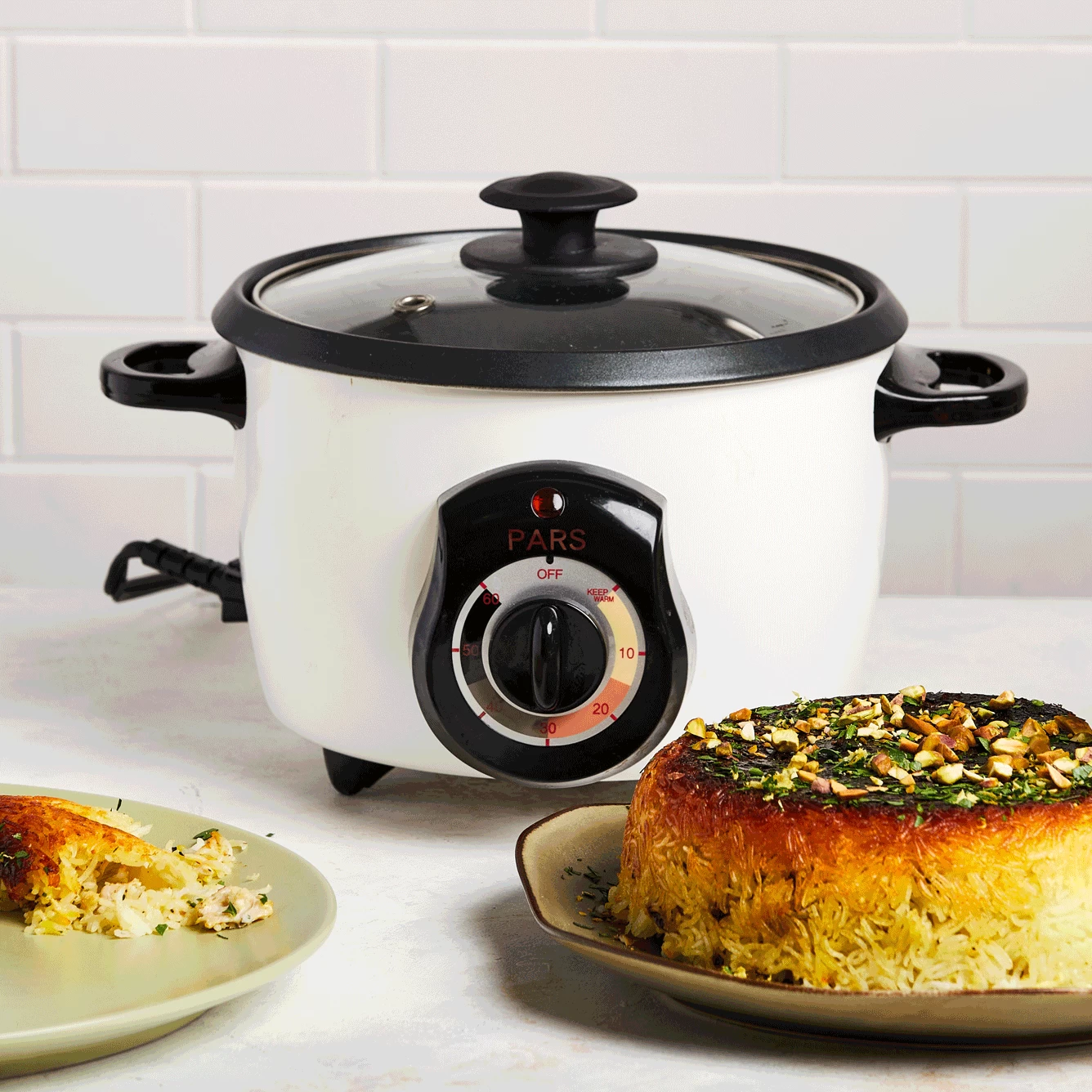 In a medium bowl, combine 1½ cups rice with enough water to cover by about 1 inch. Set aside at room temperature for at least 30 minutes or up to 12 hours. Drain the rice in a fine-mesh sieve, then rinse under cool running water and drain again. In a ramekin or small bowl, stir together ¼ teaspoon crumbled saffron threads and boiling water. In a medium bowl, stir together 1 tablespoon oil, 1 teaspoon lemon zest, 2 medium cloves of garlic, 1 tablespoon of the saffron water and ½ teaspoon each salt and pepper. Add 12 ounces of boneless, skinless chicken thighs, trimmed and cut into 1- to 1½-inch pieces and stir until evenly coated. In a large bowl, stir together the remaining 2 teaspoons lemon zest and the remaining saffron water. Stir in the drained rice. In the insert of a 5-Cup Pars Automatic Persian Rice Cooker, combine the remaining 3 tablespoons oil and ½ cup of the rice mixture. Stir well, then distribute in an even layer. To the remaining rice mixture, add the chicken mixture, along with ½ cup plain whole-milk Greek yogurt, 1 egg yolk, 3 tablespoons dried currants and ½ teaspoon salt. Stir well, then transfer to the rice cooker insert and distribute in an even layer; do not press or compact the layers. Drizzle in 1 cup water and dot with 2 tablespoons of salted butter, cut into 4 pieces. Cover with the lid and turn on the rice cooker, setting the timer for 40 minutes. When cooking is complete, immediately shut off the rice cooker by turning the dial to the “off” position, bypassing the “keep warm” stage. Let the rice rest, covered, for 5 minutes. Remove the lid. Using potholders, carefully lift the insert out of the housing and set it on a heat-safe surface. Invert a platter over the insert. Holding the platter against the insert, carefully invert the two together, then lift off the insert. Sprinkle the rice with parsley and pistachios. [/how-to-use-break]Do not use metal utensils with this pot. Not dishwasher-safe.