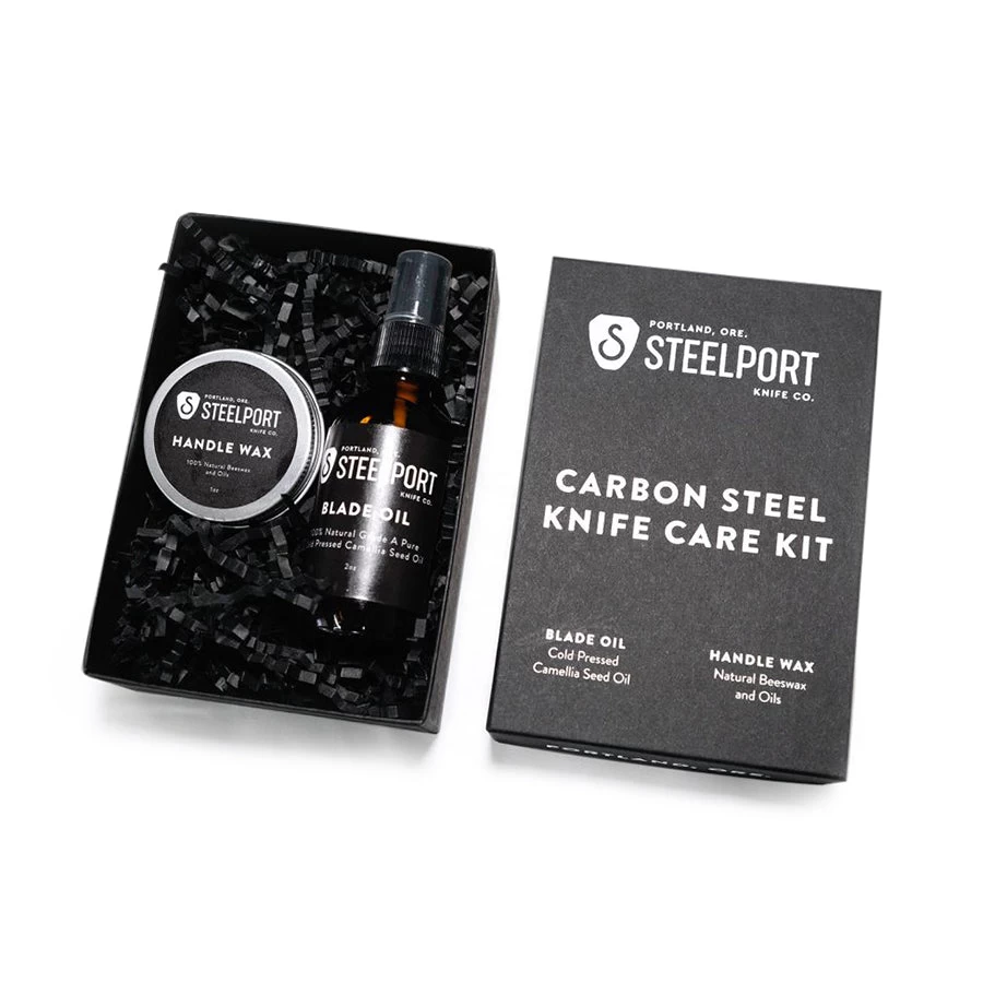 [/description-break] Specifications [/title]Materials: Grade A pure cold pressed camellia seed oil, natural beeswax and oilsPlace of Origin: Portland, Oregon[/accordion] Care and Use [/title] Use: Carbon steel knives, such as those made by Steelport, should be washed and thoroughly dried by hand. Do not clean in the dishwasher. Carbon steel will develop a patina with use. To minimize that patina, use the Steelport Knife Care Kit. If rust spots form, scrub with a slurry of baking soda dissolved in water or a rust eraser. [/accordions-break] [/how-to-use-break]Carbon steel knives, such as those made by Steelport, should be washed and thoroughly dried by hand. Do not clean in the dishwasher. Carbon steel will develop a patina with use. To minimize that patina, use the Steelport Knife Care Kit. If rust spots form, scrub with a slurry of baking soda dissolved in water or a rust eraser.