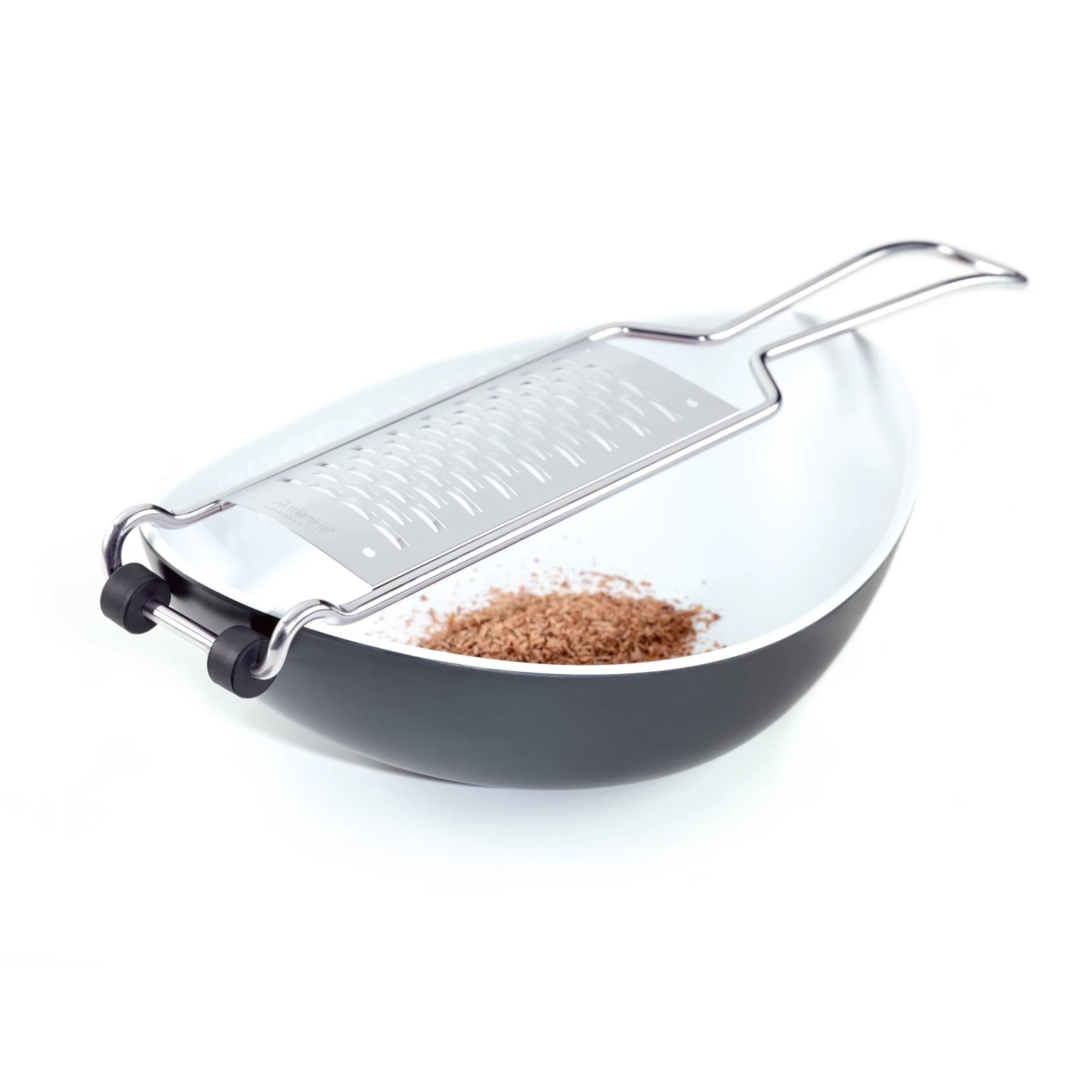 We found it: the grater that won’t make a mess and works twice as fast. A 2-in-1 “catcher” clips under the grate to capture and redirect errant shavings; to protect the grating surface, simply clip the catcher on top of the grater to guard blades (and fingers) when the grater is stored. The Reibe has an ultrasharp grate with medium holes designed to deliver a coarse shaving, perfect for grating vegetables for salads. And blades are arranged to cut foods in two directions, speeding prep time. These stainless steel graters come with nonslip nubs and a notch at the base to ensure a secure hold on cutting boards and bowls.