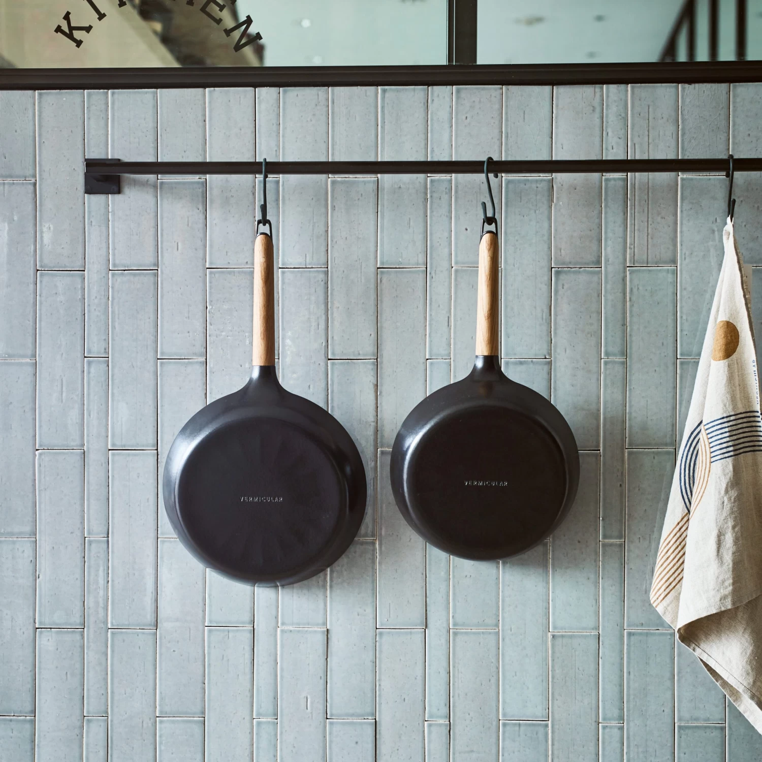 Care: Avoid metal cooking tools while using. Avoid abrasive products while cleaning. [/accordions-break] Hotter and faster, that’s the trick. [/banner_heading] The thin, lightweight design of the Vermicular skillet starts with molten iron heated to 2700 degrees Fahrenheit—hotter than most brands—and then poured into sand molds in a few seconds—a fraction of the time of other brands—to ensure durability for such an even, extremely thin product. Next, the skillet is baked at 1500 degrees Fahrenheit before the enamel coating is applied in a precise way to avoid warping. Finally, craftspeople hand-carve each wooden handle before the skillet is fully assembled. [/banner-text-break] Use as you would any 10-inch skillet.[/how-to-use-break]Compatible with all stovetops, not for oven-use. Avoid metal cooking tools while using. Avoid abrasive products while cleaning.