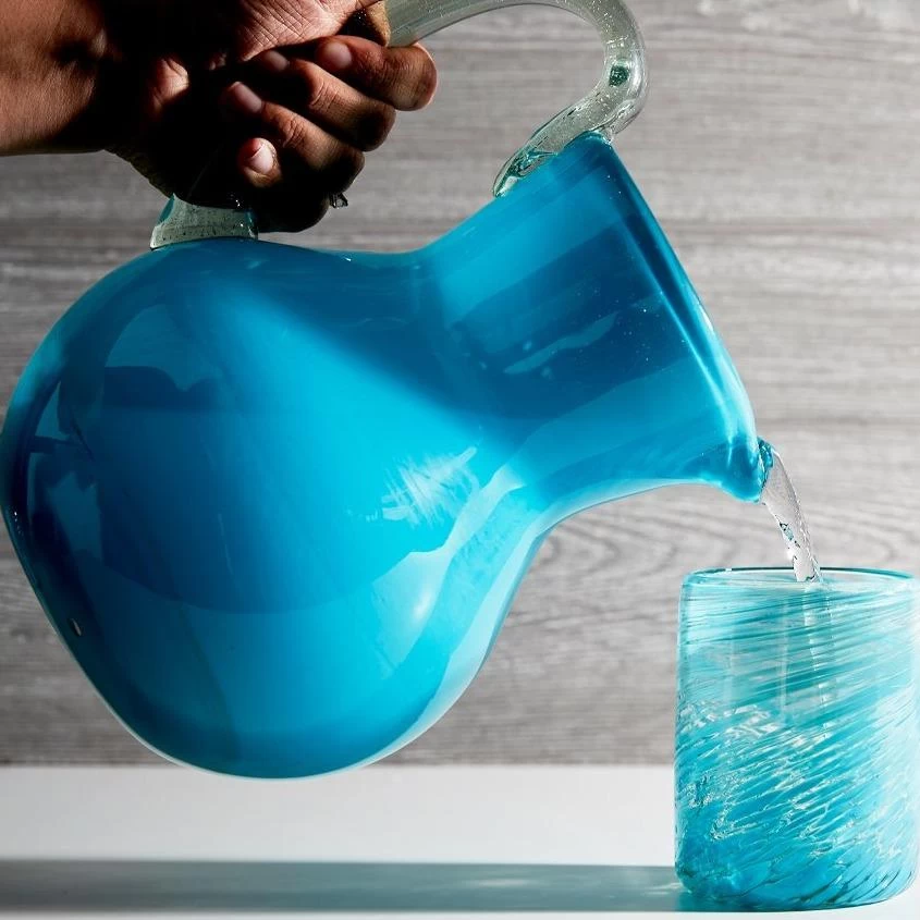 This vibrant aqua-hued pitcher is sustainably made from recycled glass and steeped in Mexican tradition. Each is crafted by a team of artisans in Tonala, Mexico, led by Javier Gutierrez Esponsa, who has been mastering the art of glassblowing for decades—beginning when he saved a glass factory from being demolished at age 22. Although each pitcher has a slightly-different character, as is the case with handmade pieces, all feature a generously sized clear glass handle and large body to hold a large amount of libations like water, iced tea and batch cocktails in style.[/description-break]Specifications[/title]​Net Weight: 2.8 liters