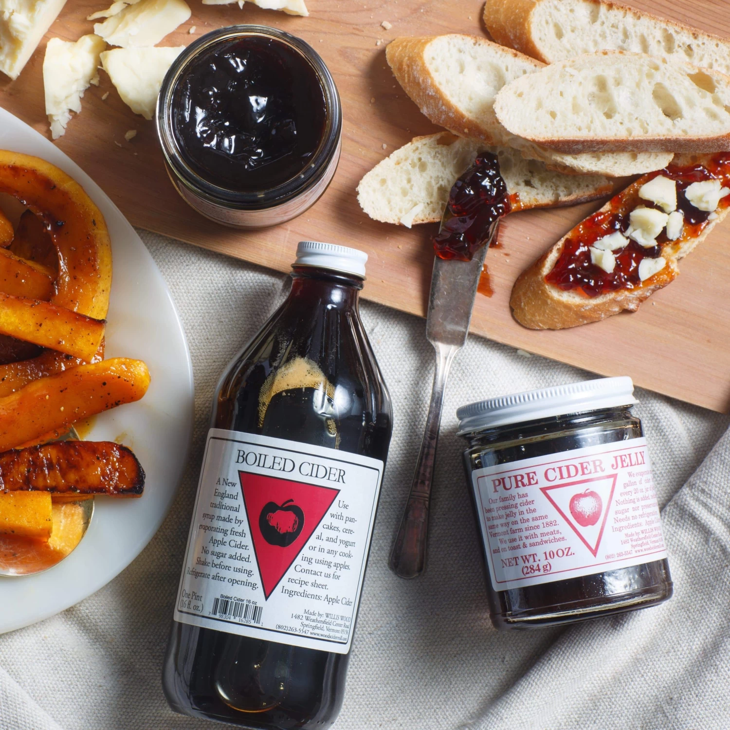 This thick, syrupy apple cider captures the essence of an apple orchard in a bottle. Simple, versatile and highly concentrated, this boiled cider has the consistency of pourable jelly, making it a perfect topping for pancakes or ice cream, a delicious warm drink component, or a flavor agent for braises and sauces. We are fans of this boiled cider because it contains no sweeteners or preservatives. Wood’s Cider Mill in Weathersfield, Vermont, has been producing this small-batch boiled cider in its 19th century cider press since 1882. The apples are ground and pressed through the screw-press, after which the cider is reduced in a wood-fired, stainless steel evaporator. A gallon of cider is concentrated down to a pint to create a rich flavor evocative of cinnamon, caramel and candy apples. It has a mild touch of tannins but remains balanced between sweet and tart.