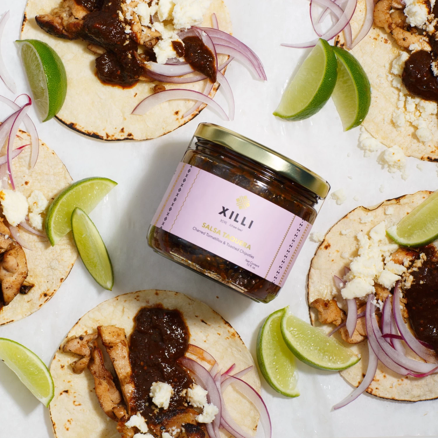 [/description-break] Ingredients [/title] Ingredients: Canola oil, fire-roasted tomatillo, blistered jalapeño, charred white onion, fire roasted garlic, toasted chipotle morita chili, Xilli mystery blend (dry chilies, dry herbs & spices), sea salt. [/accordion] Specifications [/title] Net Weight: 10 fluid ouncesPlace of Origin: [/accordions-break] Use this salsa as a topping on tacos, tostadas, in place of salsa verde in our Chilaquiles Verdes or just to simply dip your tortilla chips. We also loved it in these Seared Shrimp Tacos with Tomatoes and Cotija, either drizzled on at the end or cooked in with the shrimp.[/how-to-use-break]
